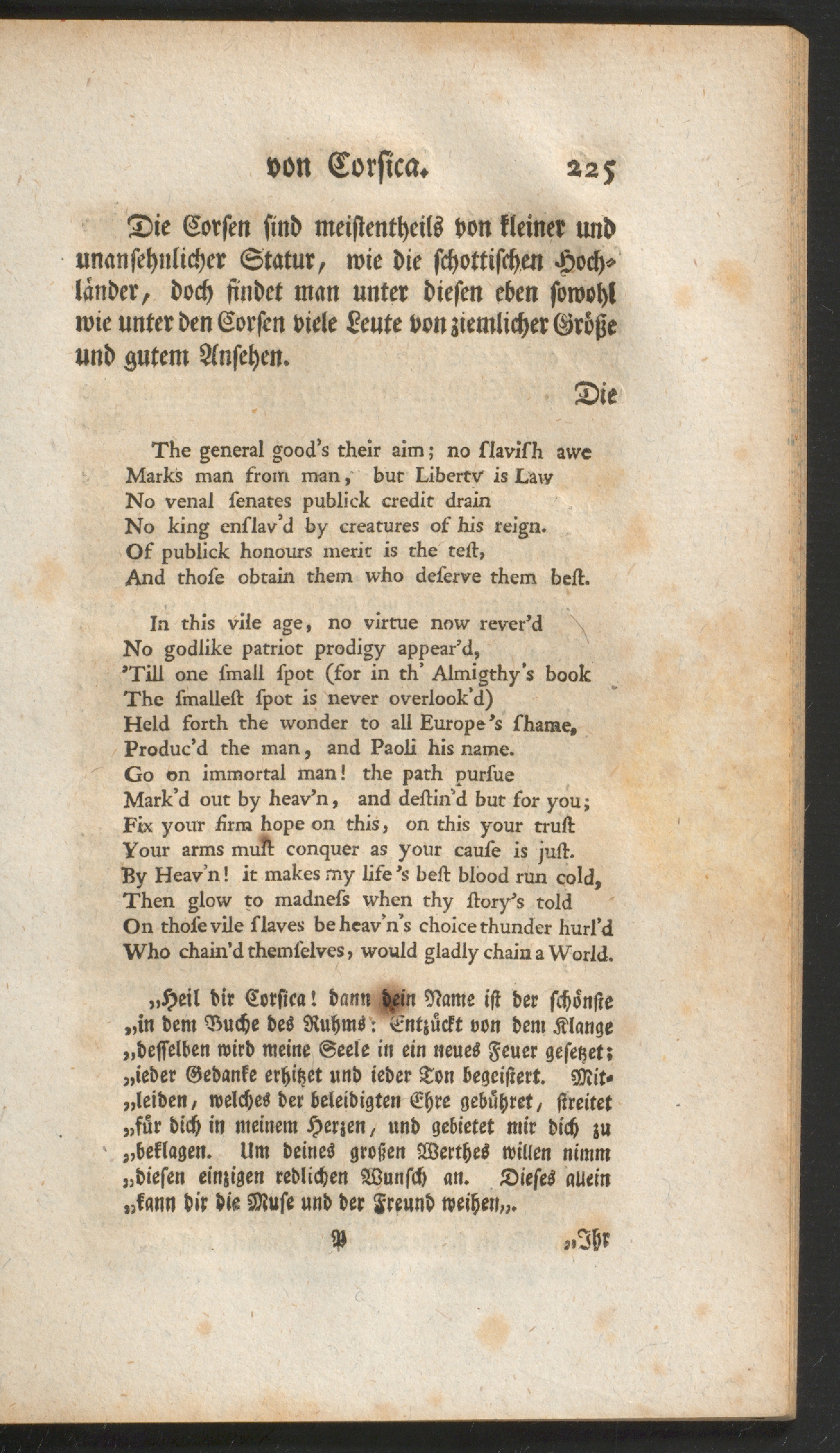 Die Corsen sind meistentheils von kleiner undunansehnlicher Statur, wie die schottischen Hoch-länder, doch findet man unter diesen eben sowohlwie unter den Corsen viele Leute von ziemlicher Größeund gutem Ansehen.