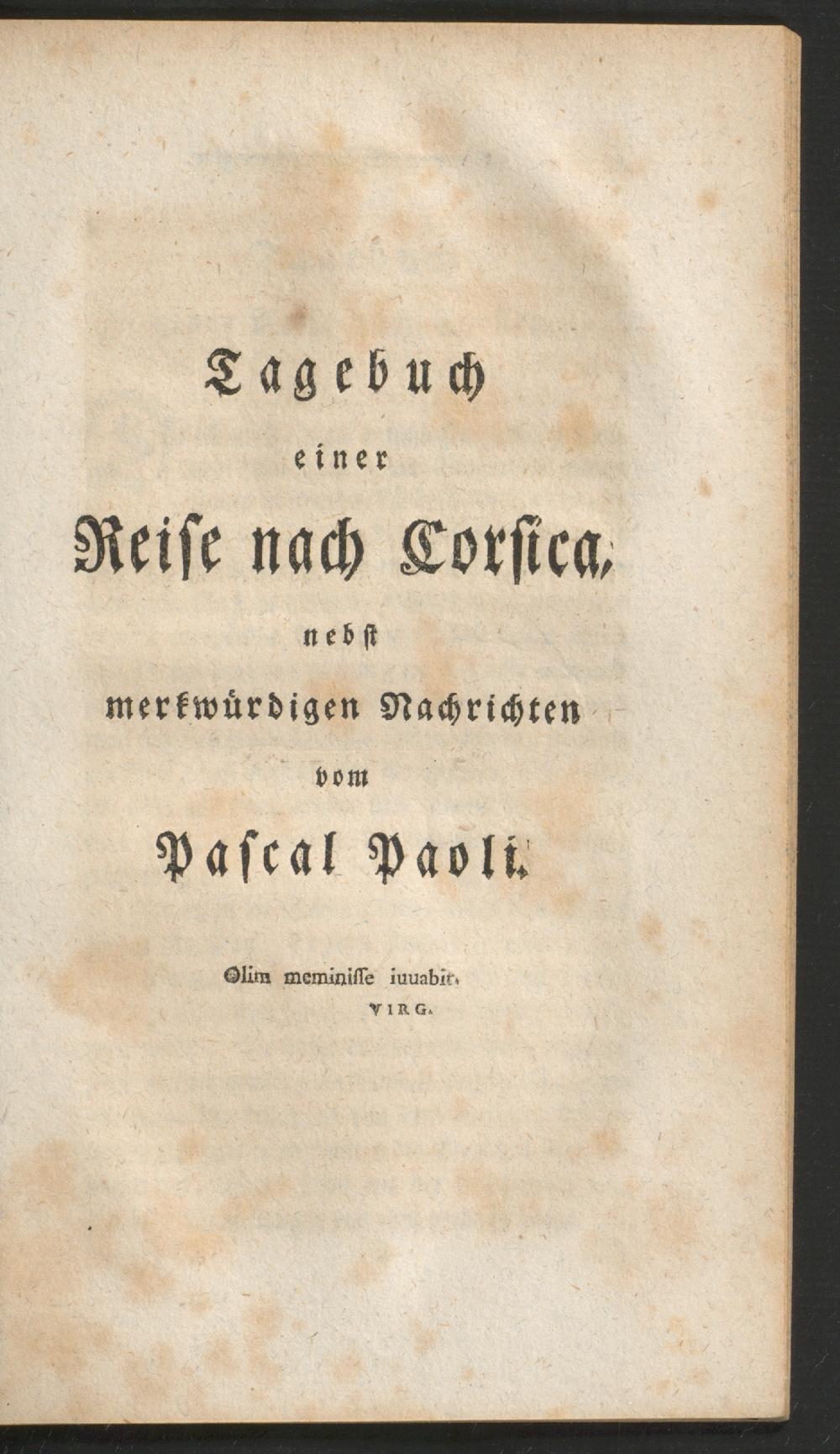 Jacob Boswells, Esq. Historisch-geographische Beschreibung von Corsica : nebst vielen wichtigen Nachrichten und Anecdoten vom Pascal Paoli, dem General der Corsen / aus dem Englischen nach der zweyten Ausgabe übersetzt und mit einer neuen und vollständigen Landkarte von Corsica erläutert