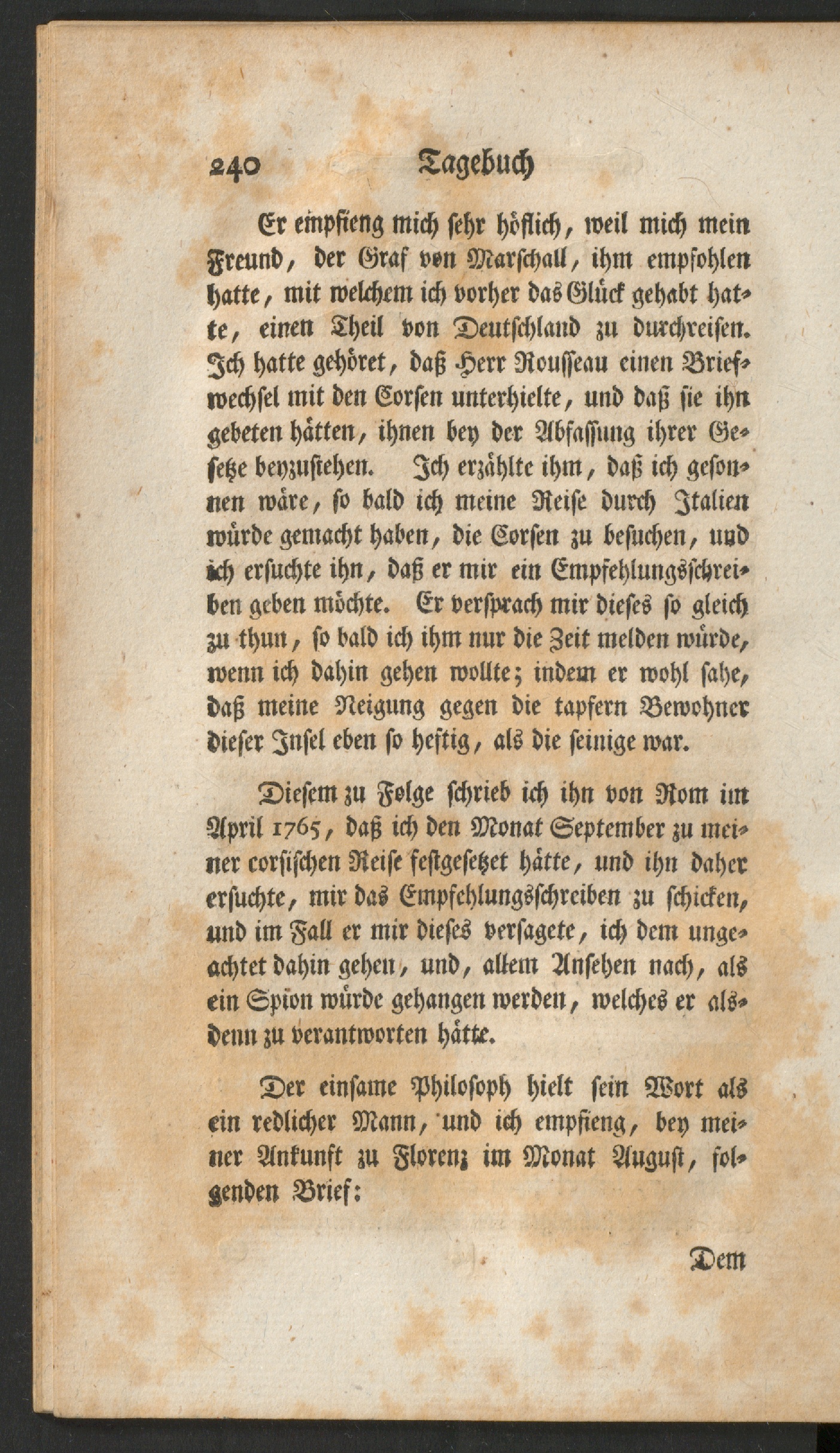 Der einsame Philosoph hielt sein Wort alsein redlicher Mann, und ich empfieng, bey mei-ner Ankunft zu Florenz im Monat August, fol-genden Brief: