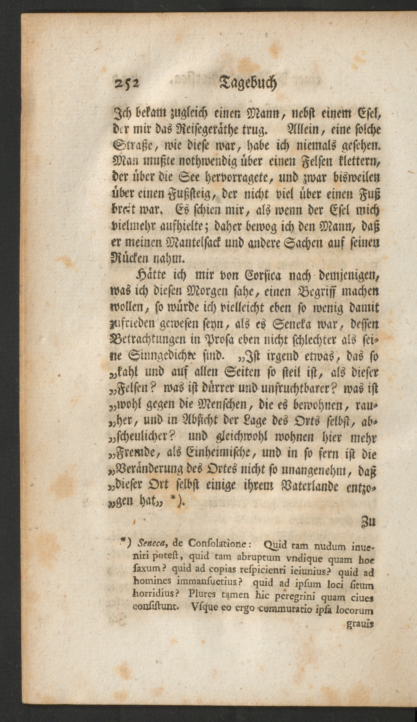 Hatte ich mir von Corsica nach demjenigen,was ich diesen Morgen sahe, einen Begriff machenwollen, so würde ich vielleicht eben so wenig damitzufrieden gewesen seyn, als es Seneka war, dessenBetrachtungen in Prosa eben nicht schlechter als sei-ne Sinngedichte sind. „Ist irgend etwas, das so„kahl und auf allen Seiten so steil ist, als dieser„Felsen? was ist dürrer und unfruchtbarer? was ist„wohl gegen die Menschen, die es bewohnen, rau-„her, und in Absicht der Lage des Orts selbst, ab»„scheulicher? und gleichwohl wohnen hier mehr„Fremde, als Einheimische, und in so fern ist die„Veränderung des Ortes nicht so unangenehm, daß„dieser Ort selbst einige ihrem Vaterlande entzo-gen hat» *).