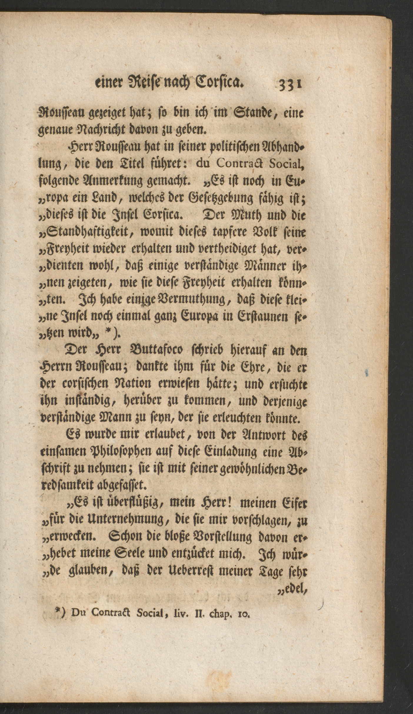 Der Herr Buttafoco schrieb hierauf an dmHerrn Rousseau; dankte ihm für die Ehre, die erder corsischen Nation erwiesen hätte; und ersuchteihn inständig, herüber zu kommen, und derjenigeverständige Mann zu seyn, der sie erleuchten könnte.