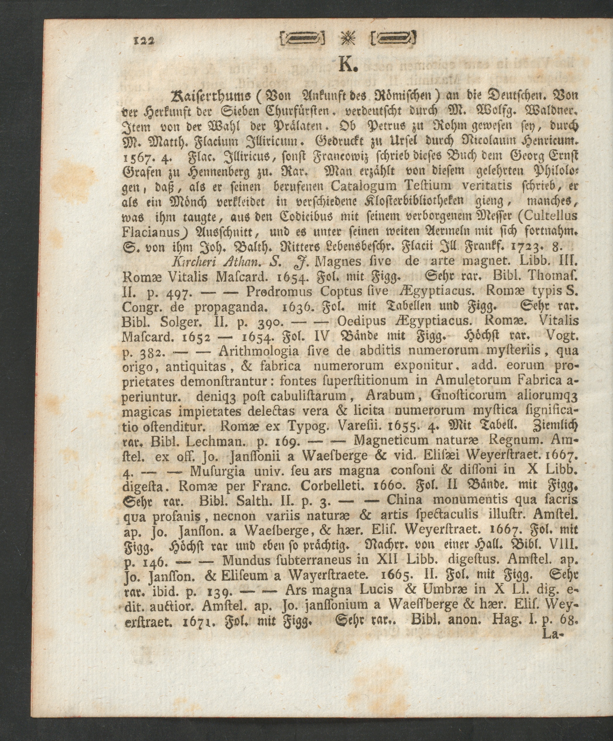 stel. ex off. Jo. Janffonii a Waesberge & vid. Elisaei Weyerstraet. 1667.4. — — Musurgia univ. seu ars magna consoni & dissoni in X Libb.digesta. Romae per Franc. Corbelleti. 1660. Fol. II Bände, mit Figg.Sehr rar. Bibi. Salth. II. p. 3. — — China monumentis qua sacrisqua profanis, necnon variis naturae & artis spectaculis illustr. Amstel.ap. Jo. Janslon. a Waesberge, & haer. Elis. Weyerstraet. 1667. Fol« mitFigg. Höchst rar und eben so prächtig. Nachrr. von einer Hall. Bibl. VIII.