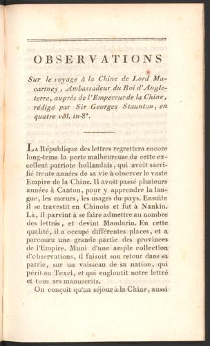 Voyage à Canton, capitale de la province de ce nom, à la Chine : par Gorée, le cap de Bonne-Espérance et les isles de France et de la Réunion / par le C. Charpentier Cossigny, ex-ingénieur : suivi d'observations sur le voyage à la Chine de Lord Macartney et du citoyen Van-Braam, et d'une Esquisse des arts des Indiens et des Chinois