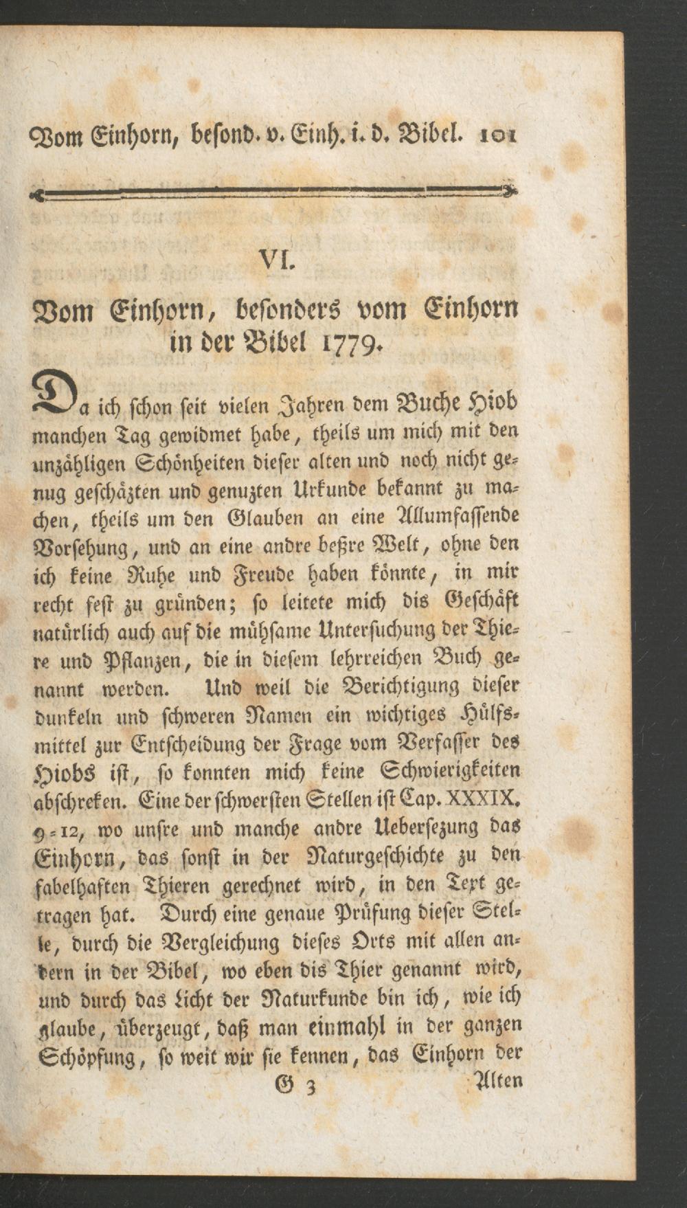 VI. Vom Einhorn, besonders vom Einhorn in der Bibel 1779.