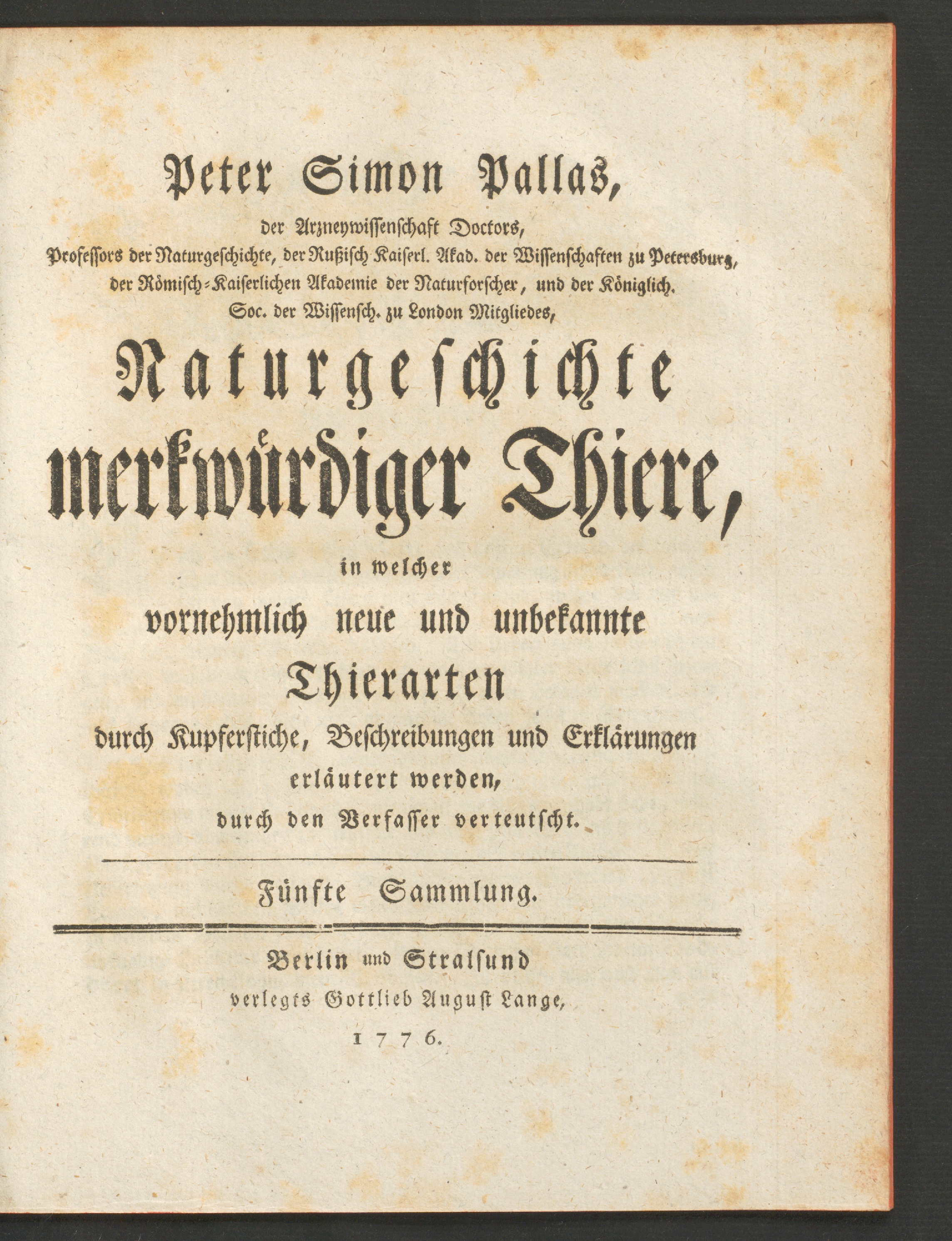 Peter Simon Pallas der Arzneywissenschaft Doctors ... Naturgeschichte merkwürdiger Thiere, in welcher vornehmlich neue und unbekannte Thierarten durch Kupferstiche, Beschreibungen und Erklärungen erläutert werden / Durch den Verfasser verteutscht : in welcher vornehmlich neue und unbekannte Thierarten durch Kupferstiche, Beschreibungen und Erklärungen erläutert werden / durch den Verfasser verteutscht