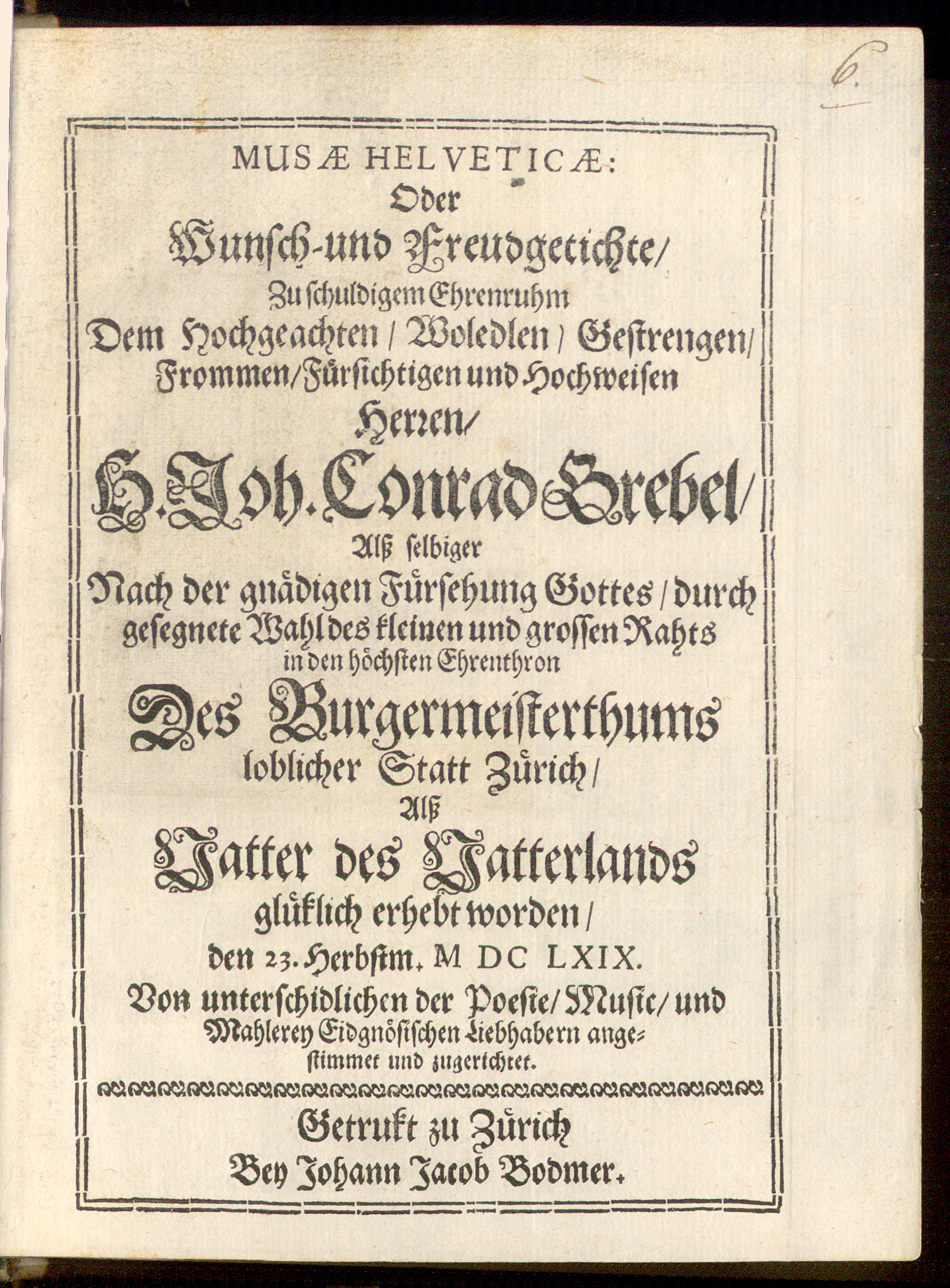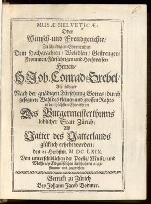 Musae Helveticae : oder Wunsch- und Freudgetichte, zu schuldigem Ehrenruhm dem hochgeachten, woledlen, gestrengen, frommen, fürsichtigen und hochweisen Herren, H. Joh. Conrad Grebel, alss selbiger nach der gnädigen Fürsehung Gottes, durch gesegnete Wahl des kleinen und grossen Rahts in den höchsten Ehrenthron des Burgermeisterthums loblicher Statt Zürich als Vatter des Vatterlands glüklich erhebt worden, den 23. Herbstm. M DC LXIX / von unterschiedlichen der Poesie, Music, und Mahlerey eidgenössischen Liebhabern angestimmet und zugerichtet
