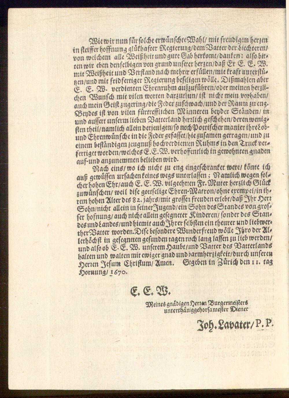 Musae Helveticae : oder Wunsch- und Freudgetichte, zu schuldigem Ehrenruhm dem hochgeachten, woledlen, gestrengen, frommen, fürsichtigen und hochweisen Herren, H. Joh. Conrad Grebel, alss selbiger nach der gnädigen Fürsehung Gottes, durch gesegnete Wahl des kleinen und grossen Rahts in den höchsten Ehrenthron des Burgermeisterthums loblicher Statt Zürich als Vatter des Vatterlands glüklich erhebt worden, den 23. Herbstm. M DC LXIX / von unterschiedlichen der Poesie, Music, und Mahlerey eidgenössischen Liebhabern angestimmet und zugerichtet