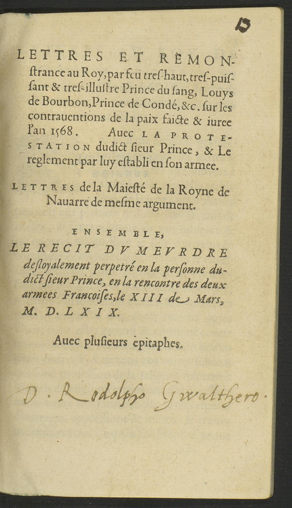 Lettres et remonstrance au Roy / par ... Louys de Bourbon, Prince de Condé, &c. sur les contraventions de la paix faicte & juree l'an 1568, avec la protestation dudict sieur Prince, & le reglement par luy establi en son armee : lettres de la Maiesté de la Royne de Navarre de mesme argument : ensemble, le recit du meurdre desloyalement perpetré en la personne dudict sieur Prince, en la rencontre des deux armees francoises, le XIII de mars, M.D.LXIX